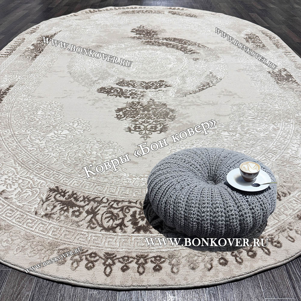 Классический ковер дизайн 104 Белый с бежевым Овал станет шикарным преображением вашей комнаты, подчеркивая высокий статус хозяина.