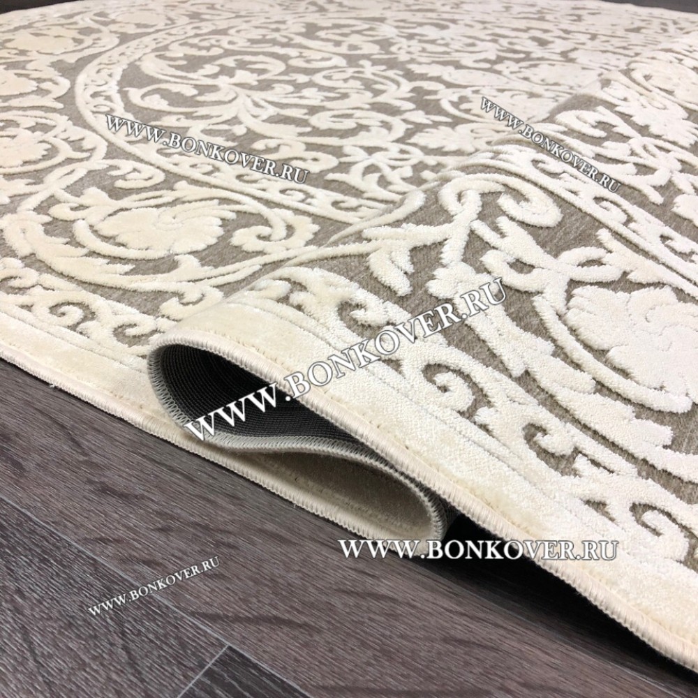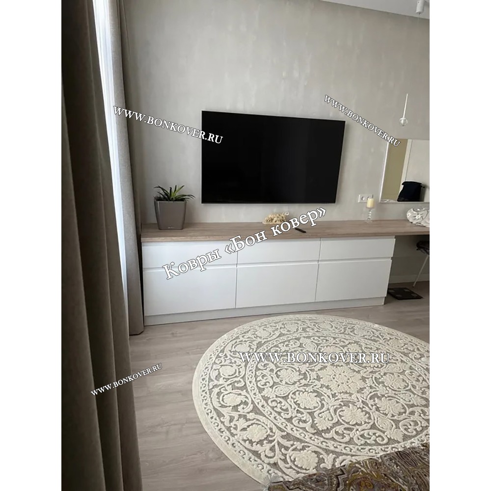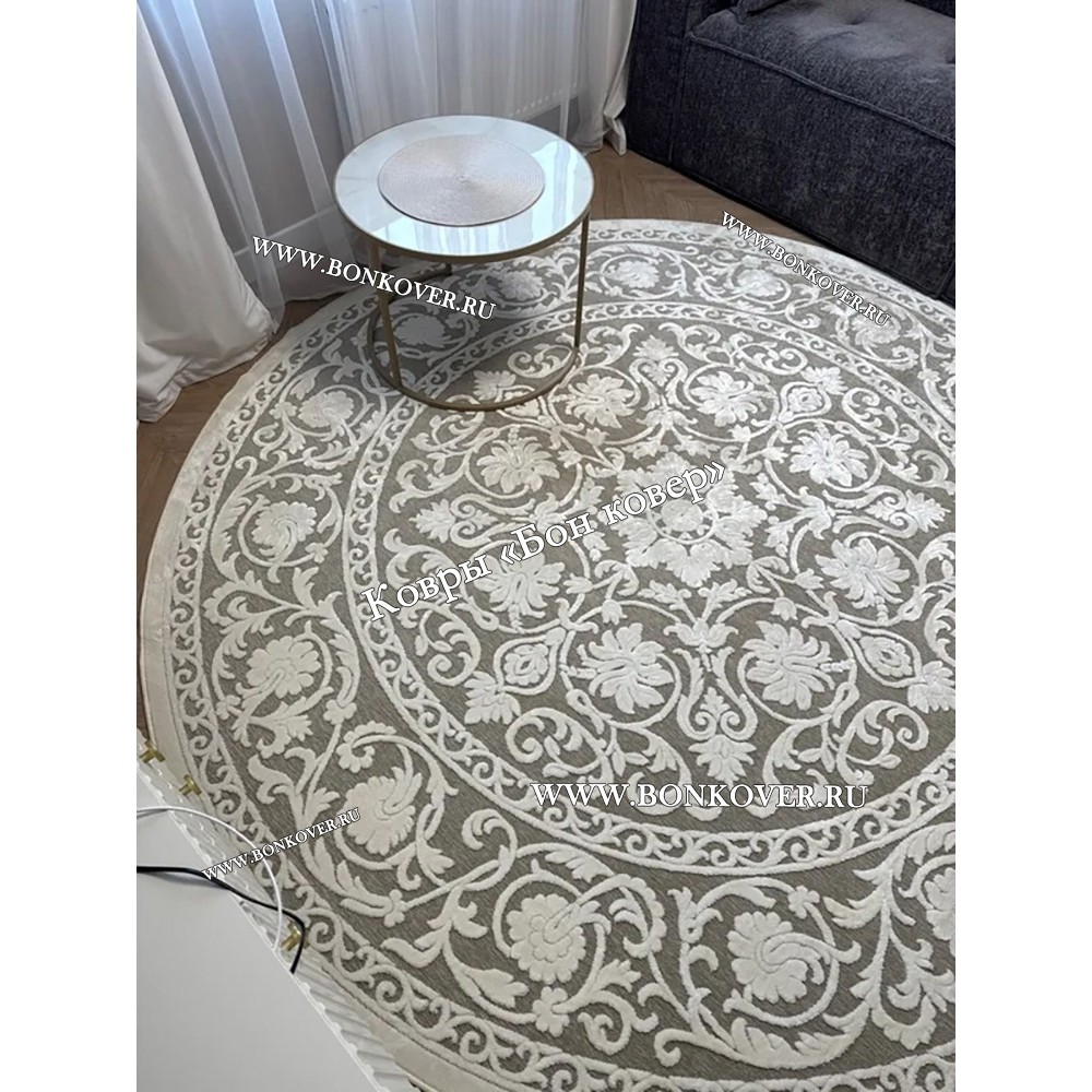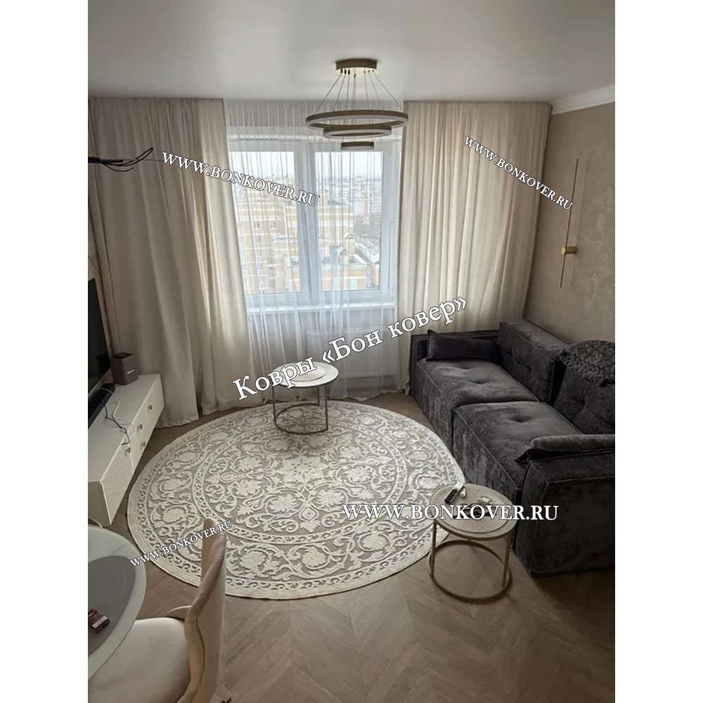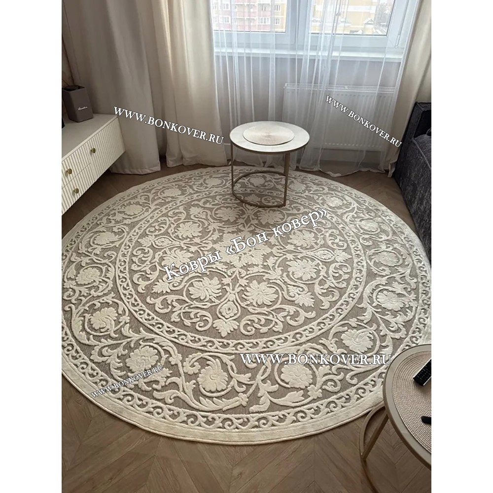 Шикарный Круглый Белый Шелковистый Ковер Дизайн 30542 наполняет интерьер гостиной теплом и уютом, гармонично сочетает в себе изящество и стиль. Он изготовлен из современных материалов, комфортный и долговечный.